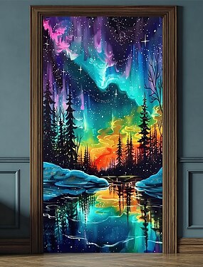Cartel para puerta con auroras boreales, bosque boreal, cielo estrellado, siluetas de árboles, lago, reflejo, paisaje invernal, cubierta de puerta para dormitorio, sala de estar, decoración del hogar,
