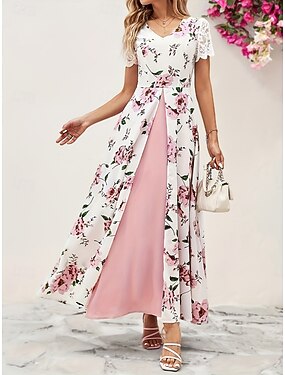 Mujer Vestido largo maxi Vestido de raso Vestido de flores Vestido Estampado Elegante Moda Moderno Diario Exterior Vacaciones Ajuste regular Floral Manga Corta Escote en Pico Rosa Verano Primavera