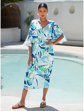 Mujer Vestido Kaftan Vestido Estampado Vestido a media pierna Vestido Midi Azul Piscina Mangas medias Flor / Plantas Estampado Primavera verano Escote en Pico Estilo playero Playa XS S M