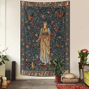 Tapiz de pared Flora, sierva de la tierra, estilo William Morris. Soy la sierva de la tierra. Bordé su glorioso vestido. Arte de diosa victoriana para colgar en la pared, sala de estar, dormitorio,
