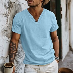 Hombre Camiseta superior Camiseta de lino Mangas cortas Escote en Pico Verano Plano Moda Design Básico Suave Vacaciones Casual Diario Playa Bleu Ciel Blanco Rosa Camiseta superior para hombre