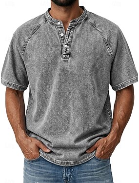 Hombre Camiseta Camisa vaquera Camisa 100% algodón con lavado ácido Top con cuello henley Manga Corta Plano Vintage Ropa de calle Casual Lavado Mangas raglanes Escote Chino Henley Casual Hogar Calle