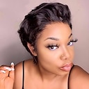 Peluca Cabello humano remy Frente de encaje 13x1 Cabello Brasileño Recto Natural Corte Pixie Parte libre Mujer Densidad 120% Entradas Naturales 100% Virgen Corta Color natural Pelucas de Cabello |