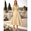 Corte A Vestido Midi Vestidos de coctel Vestidos de fiesta Elegante Vintage Talla Grande Manga 3/4 Escote en Pico Invitado a la boda Satén con Plisado |