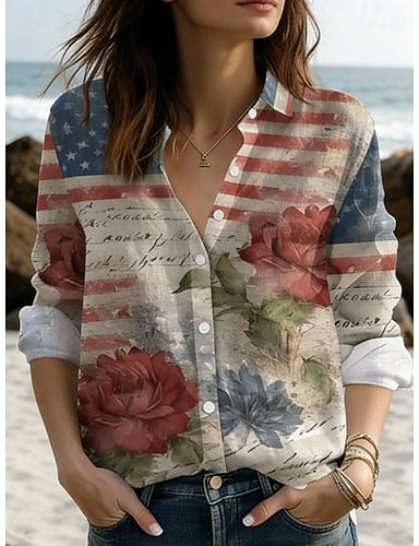 Camiseta de Mujer Día de la Independencia Americana Botones Impresión Gráfica Aniversario de América Vintage Elegante Moderna Manga Larga Cuello de Camisa Tops Regulares Diarios Azul Negro Rojo Rojo