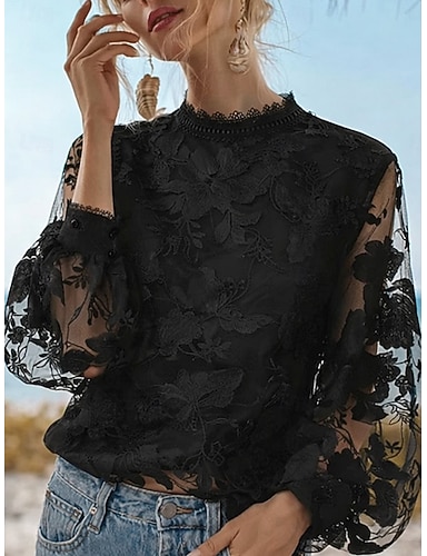 Mujer Blusa Encaje Color sólido Elegante Básico Casual Manga Larga Cuello Alto Tops regulares Diario Negro Primavera Otoño