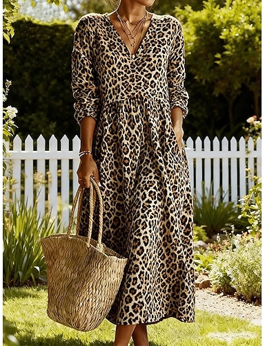 Mujer Vestido maxi Vestido de Camisa Vestido informal Moda Básico Moderno Diario Exterior Playa Ajuste regular Leopardo Manga 3/4 Escote en Pico Marrón Verano Primavera