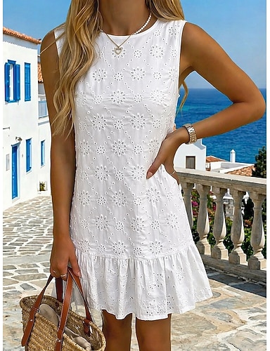 Mujer Mini vestido Vestido blanco Vestido con ojales Moda Moderno Playa Vacaciones Festivos Ajuste regular Floral Sin Mangas Cuello Barco Blanco Verano Primavera