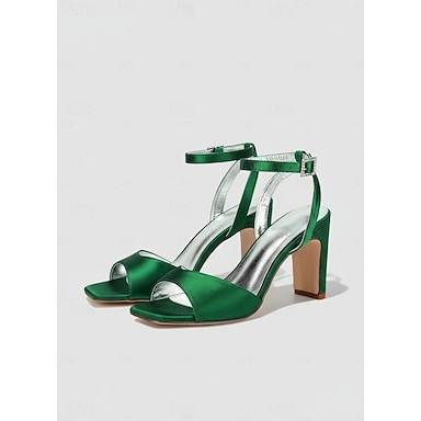Sandalias de tacón alto con correa al tobillo, de satén verde para mujer - elegantes sandalias de fiesta con tacón cuadrado y punta abierta para bodas y eventos nocturnos &eventos especiales