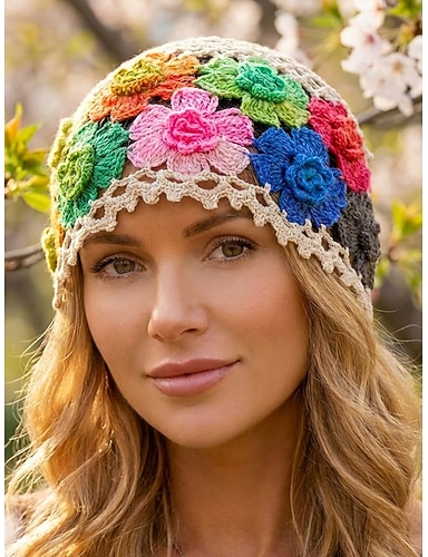 Gorro de flores de crochet para mujer, disponible en varios colores, material de punto, perfecto para ropa informal de primavera y verano.