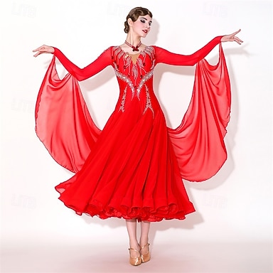 Elegante vestido rojo de baile de salón para mujer, adornado con pedrería, ideal para vals, tango, rumba moderna y competiciones.