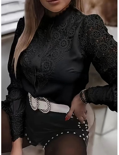 Mujer Camisa de encaje Blusa Encaje Retazos Color sólido Elegante Casual Manga Larga Escote en Pico Tops regulares Diario Azul Piscina Negro Blanco Amarillo Rojo Primavera Otoño