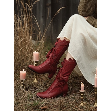 Botines rojos victorianos de mujer con cordones, confeccionados en piel sintética roja y encaje, con detalle de mariposa y lazo. Estilo vintage de los años 20, ideales para ocasiones informales, formales y especiales.