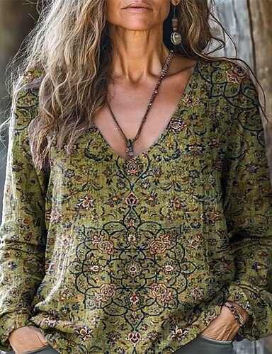 Mujer Camiseta bohemia Camiseta Camiseta superior Estampado Floral Graphic Vintage Étnico Casual Manga Larga Escote en Pico Tops regulares Diario Fin de semana Ropa de vacaciones Naranja Verano