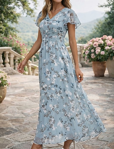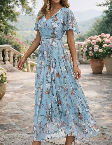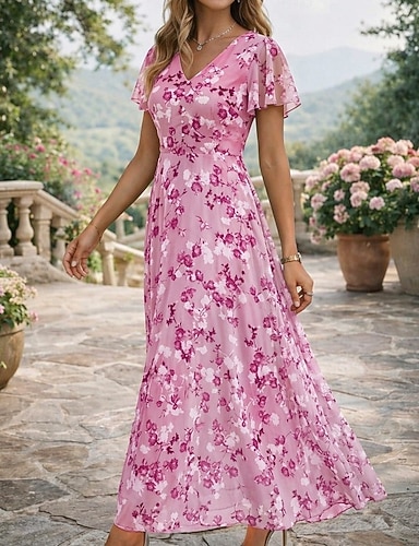 Corte A Hasta el Suelo Vestido de flores Vestidos de noche Elegante Vintage Floral Manga Corta Escote en Pico Fiesta de jardin Boda Bolsillo Satén Jacquard con Borla Abertura