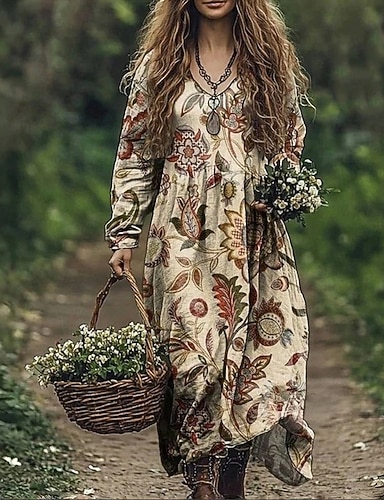 Vestido bohemio floral para mujer, vestido maxi con cuello en V, vestido vintage, vestido estampado, moda moderna, verano primavera