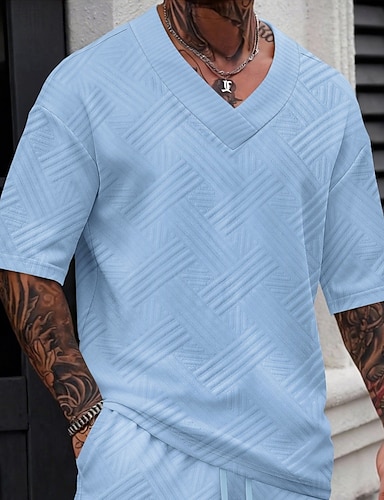 Hombre Camiseta Camiseta superior Mangas cortas Escote en Pico Verano Primavera Primavera verano Color sólido Con Texturas Moda Design Básico Jacquard Casual Vacaciones Calle Negro Blanco Azul