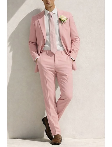 De los hombres Trajes de Lino boda en la playa Casual Amarillo Rosa Primavera verano Traje Solapa de Pico Moda Ligeras Color sólido Ajustado Juego de 2 piezas Recto 2 botones