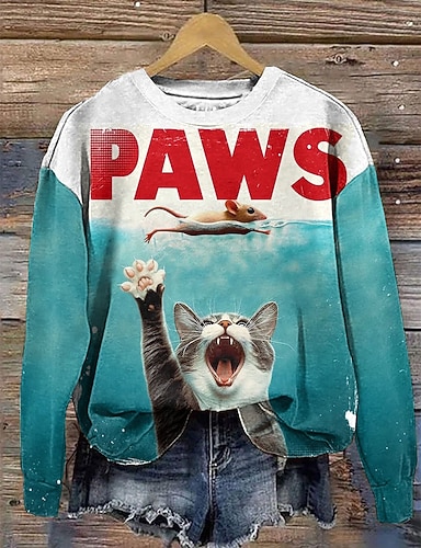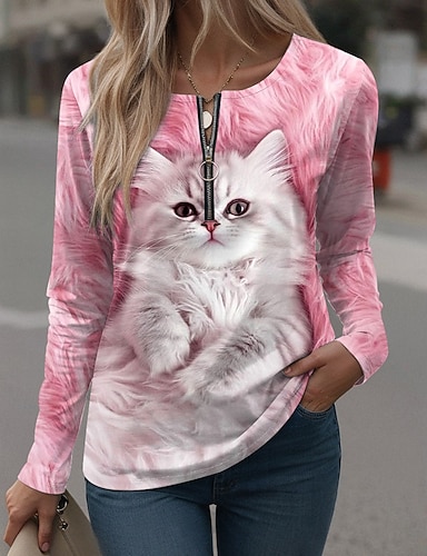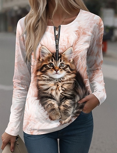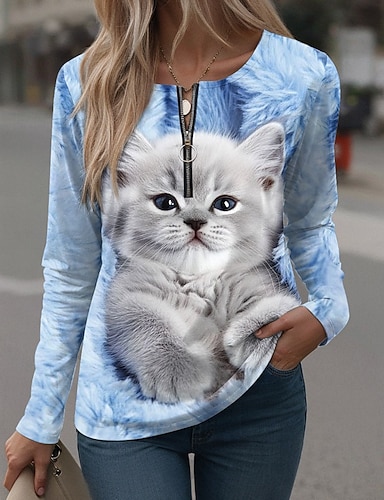 Navidad Mujer Camiseta Estampado Graphic Animal Gato Vintage Moda Elegante Manga Larga Cuello Barco Escote Redondo Tops regulares Diario Fin de semana Azul Piscina Negro Blanco Rosa Verde Trébol