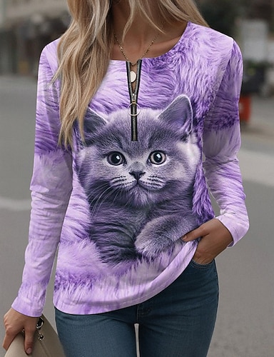 Mujer Camiseta Estampado Graphic Animal Gato Vintage Elegante Clásico Manga Corta Cuello Barco Escote Redondo Tops regulares Diario Fin de semana Azul Piscina Negro Blanco Rosa Morado Verano Primavera