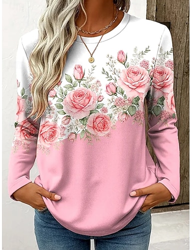 Mujer Camiseta Estampado Floral Graphic Plantas Vintage Elegante Clásico Manga Larga Cuello Barco Escote Redondo Tops regulares Diario Rosa Primavera Otoño Invierno