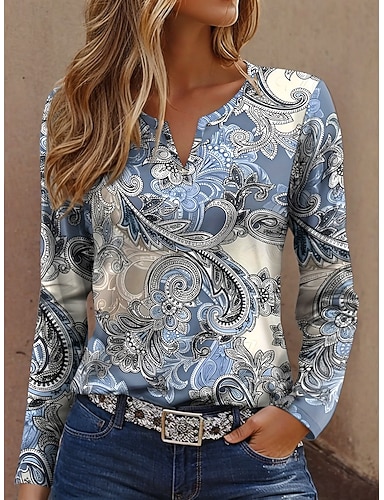 Mujer Camiseta Estampado Graphic Geometría Vintage Moda Moderno Manga Larga Cuello con muescas. Tops regulares Diario Fin de semana Azul Piscina Amarillo Morado Verde Trébol Verano Primavera