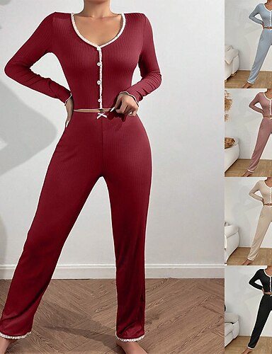Mujer Ropa de salón Conjunto pijama Moda Casual Suave Color puro Encaje Cintura elástica Botones Pantalón Hogar Vacaciones Manga Larga Escote en Pico Negro Blanco Rosa Vino Beige Otoño Invierno