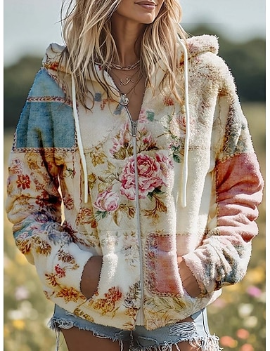Mujer Sudaderas con cremallera Correa Cremallera Floral Graphic Animal Elegante Cálido Activo Manga Larga Con Capucha Tops regulares Casual Hogar Trabajo Blanco Primavera Otoño Invierno