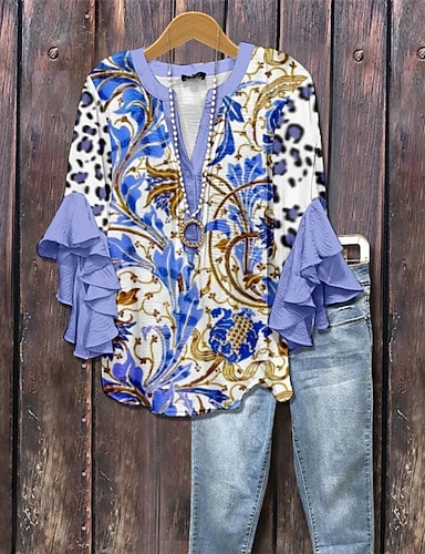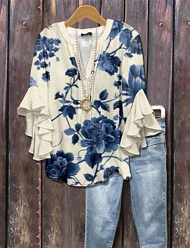 Mujer Camiseta Camiseta superior Volante Estampado Floral Graphic Moda Moderno Media Manga Escote en Pico Tops regulares Diario Noche Azul Piscina Rosa Marrón Verano Primavera