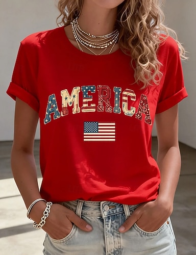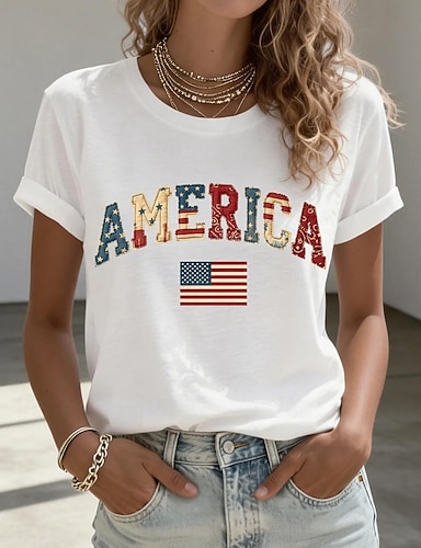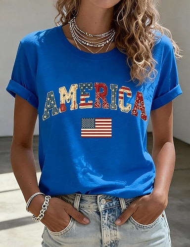 Camiseta patriótica de mujer del Día de la Independencia gráfica bandera floral moda casual de manga corta cuello redondo tops regulares diaria estampado azul caqui verano primavera