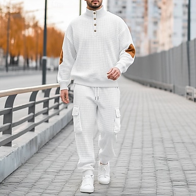 Hombre Sudadera Tracksuit Sudadera con capucha y diseño de gofres Conjunto de atuendo Escote Chino Exterior Diario Deportes Jacquard Correa Abotonar Bloque de color Rojo tinto Blanco Verde Claro Ropa