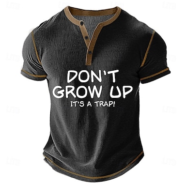 Camiseta gráfica para hombre de manga corta con henley divertida con la cita '¡No crezcas es una trampa!' - Humor de estilo de vida