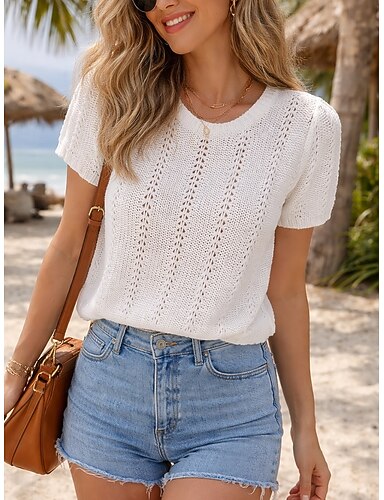 Mujer Camiseta Camiseta superior Agujero Plano Moda Elegante Clásico Manga Corta Cuello Barco Tops regulares Casual Diario Noche Blanco Verano Primavera
