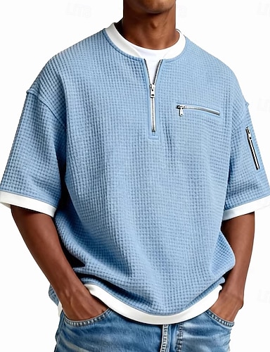 Hombre Camiseta con diseño de gofre Camiseta superior Manga Corta Henley Verano Primavera Primavera verano Color sólido Moda Design Casual Multi capa falso de dos piezas Casual Diario Exterior Azul