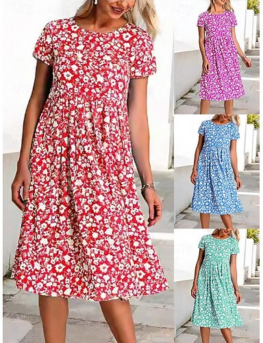 Mujer Vestido Midi Vestido de flores Vestido Estampado Moda Moderno Exterior Vacaciones Fin de semana Holgado Floral Manga Corta Cuello Barco Azul Piscina Rojo Morado Verde Trébol Verano Primavera