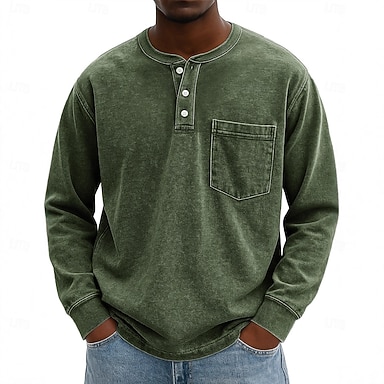 Hombre camisa de la vendimia Henley Shirt camiseta Manga Larga Cosecha Un Color Retro Antiguo Casual Estilo retro Desteñido Lavado Henley Casual Primavera Otoño Todas las Temporadas Negro Rosa Gris