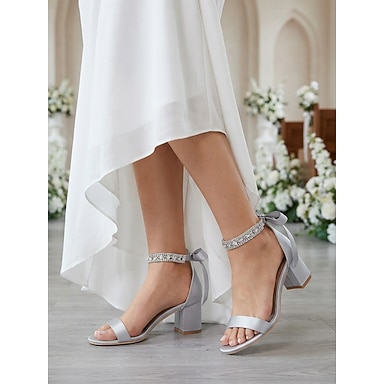 Sandalias de tacón de bloque plateadas para mujer, zapatos de novia con punta abierta y tira de cristal en el tobillo para bodas en la iglesia.