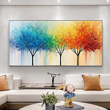 Pintura de paisaje de árboles coloridos hecha a mano, gran arte mural de bosque, gran pintura al óleo original sobre lienzo, pintura de la temporada de otoño, pintura para sala de estar