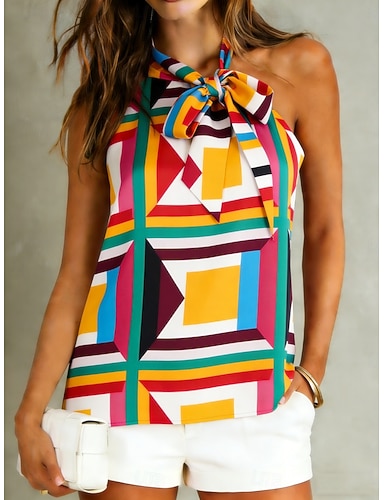 Mujer Top de satén Top con cuello halter Camiseta sin mangas Camisa sin mangas Nudo de corbata Graphic Geométrico Moda Clásico Casual Sin Mangas hombro frío Tops regulares Diario Noche Fin de semana
