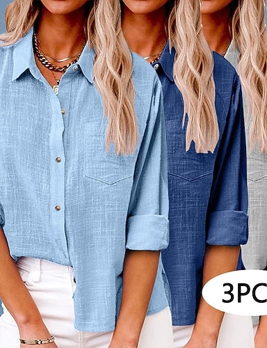 Paquete múltiple de 3 camisas de mujer, blusa abotonada, manga larga, algodón, bolsillo, botones, color liso, estilo vintage, elegante, cuello clásico, estilo casual, ropa urbana, azul, blanco y rosa.