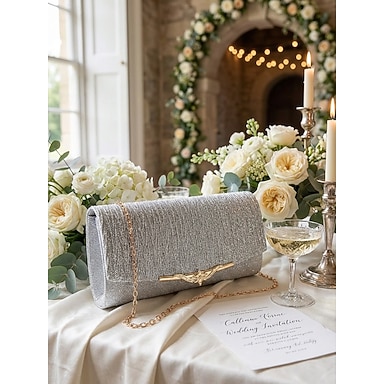 Elegante bolso de mano de noche con purpurina dorada: bolso de fiesta para mujer con correa de cadena y detalle decorativo de metal para bodas y eventos formales