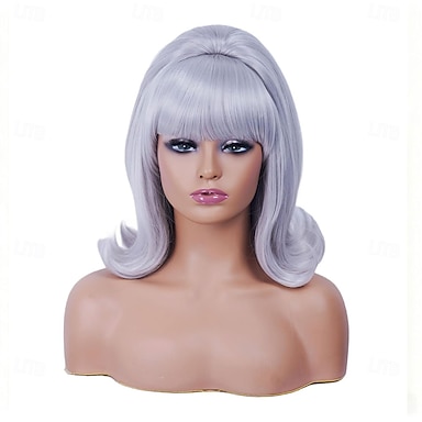 Peluca vintage corta ondulada blanca plateada con flequillo, estilo retro, estilo colmena, ideal para disfraces de los años 80 o fiestas de Halloween.