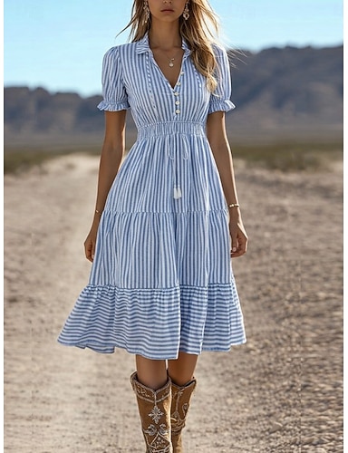 Mujer Vestido Midi Vestido de una línea Vacaciones Casual Exterior Noche Ajuste regular Raya Manga Corta Escote en Pico Azul marinero Amarillo Azul cielo Beige Verano Primavera