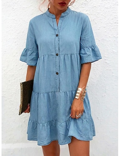 Mujer Mini vestido Vestido informal Vestido de una línea Vestido de imitación de mezclilla Moda Básico Diario Exterior Vacaciones Holgado Plano Manga Corta Escote Chino Azul claro Verano Primavera