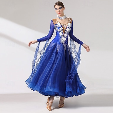 Baile de Salón Vestido Pedrería Corte Mujer Rendimiento Fiesta Manga Larga Malla Fibra de Leche