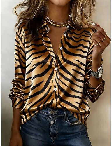 Mujer Camisa Camisa de raso Estampado A Rayas Vacaciones Moda Diario Manga Larga Cuello Camisero Tops regulares Diario Fiesta Festivos Naranja Verano Primavera Otoño