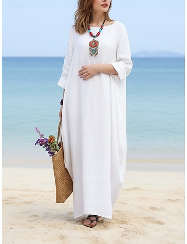 Mujer Vestido maxi Lino de algodón sintético Vestido de cambio Vestido Kaftan Vestido informal Moda Moderno Diario Vacaciones Noche Holgado Plano Manga Larga Cuello Barco Blanco Verano Primavera Otoño