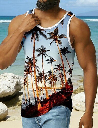 Camiseta interior sin mangas para hombre, cuello en U, estampado de palmeras tropicales, playa, costa, vacaciones, viajes, moda clásica, cómoda, informal, deportiva, para hombre, tallas S-XXXL