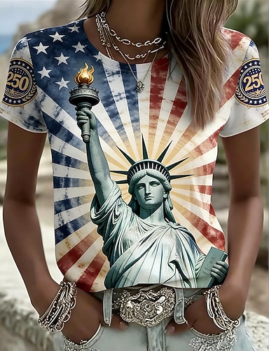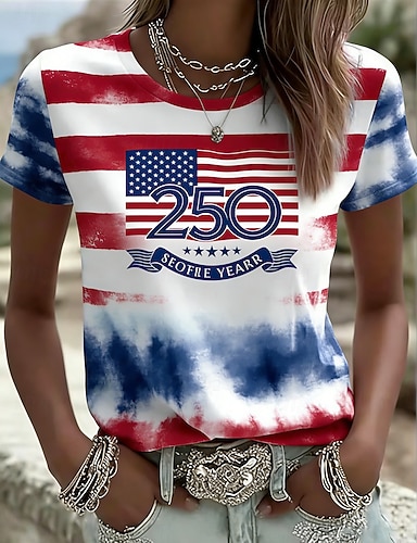 día de la independencia americana Mujer Camiseta Estampado Graphic Bandera estadounidense Moda Elegante Clásico Manga Corta Cuello Barco Tops regulares Casual Diario Azul Piscina Rojo Verano Primavera