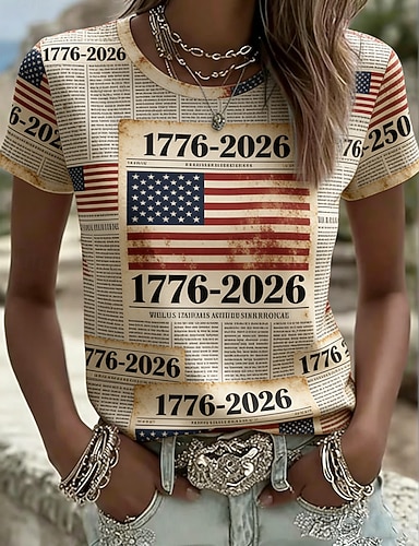 Día de la Independencia Aniversario Americano Camiseta Patriótica de Mujeres Estampado Gráfico Bandera Americana Vintage Estilizada Clásica de Manga Corta Cuello Redondo Regular Tops Diarios Fin de